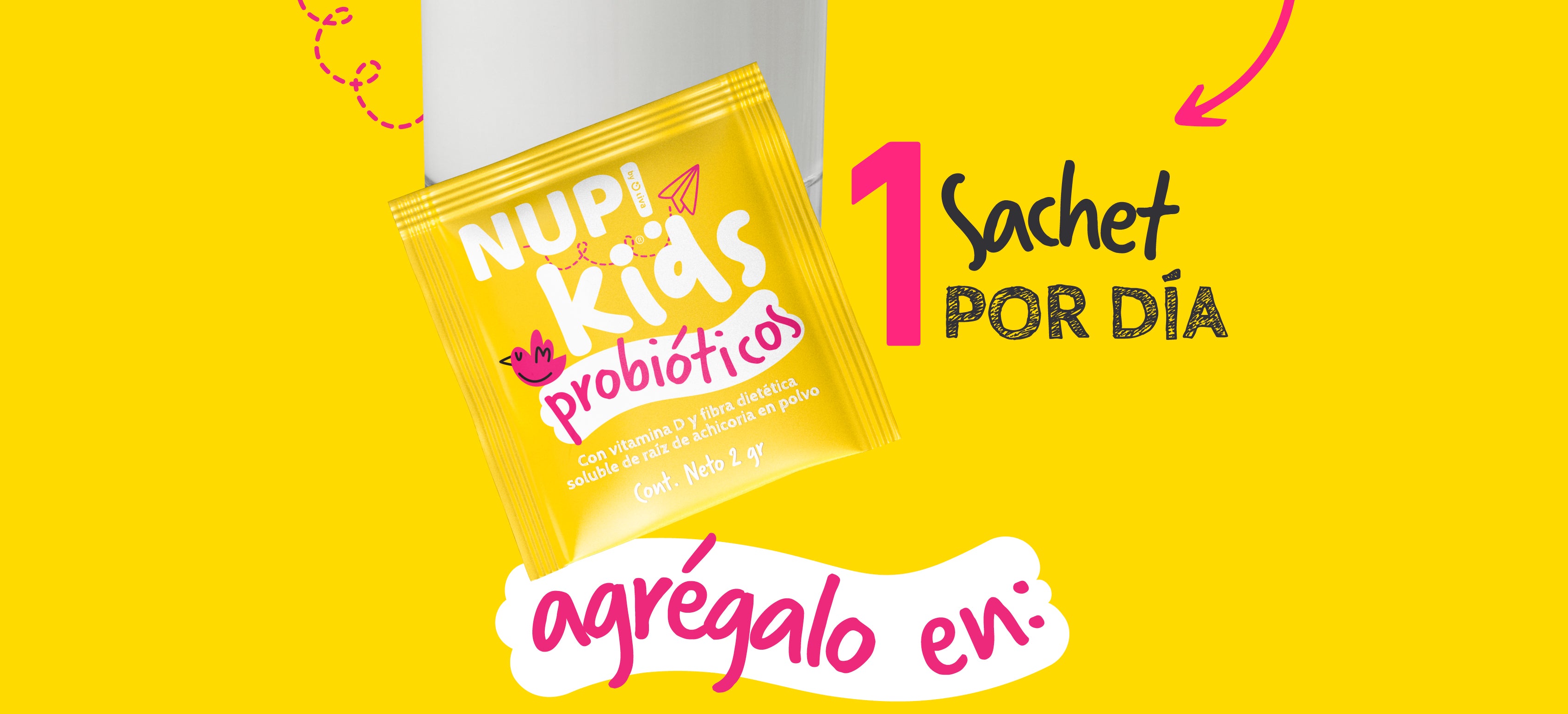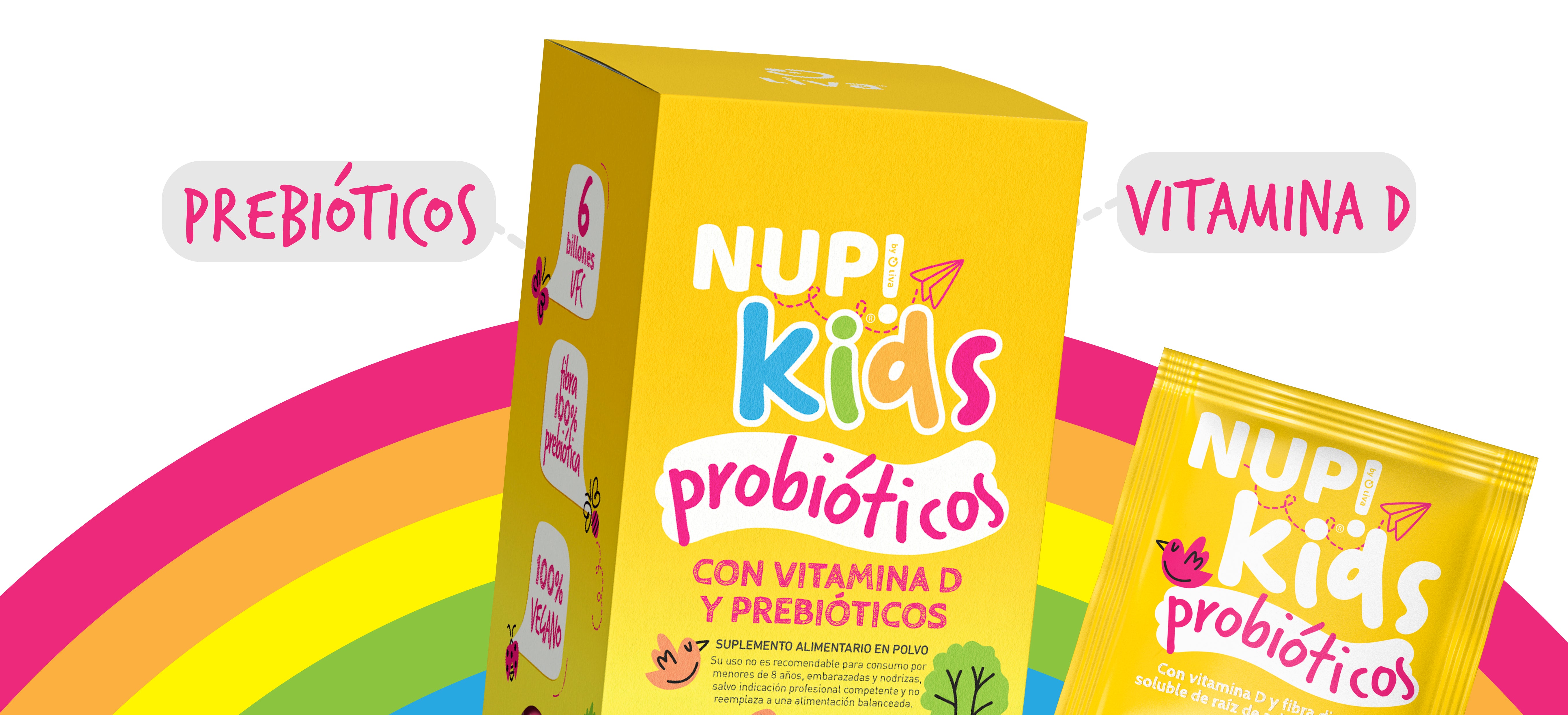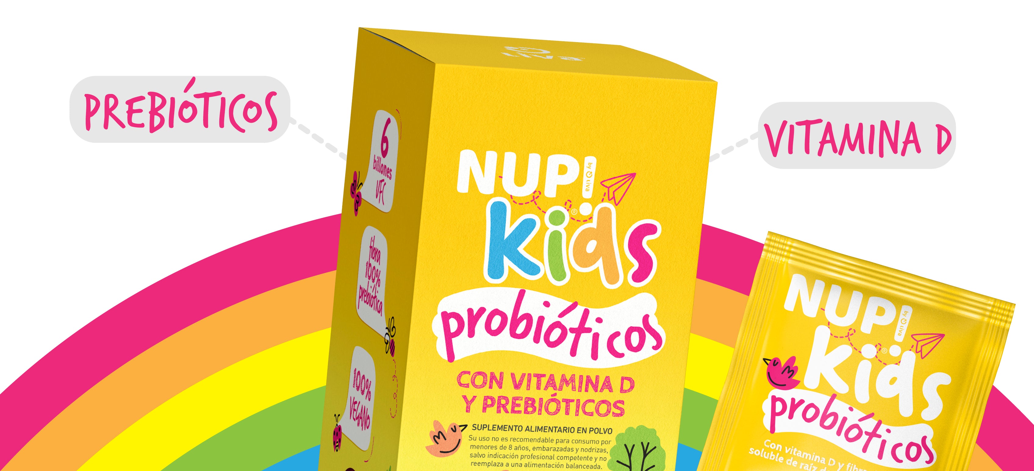 NUP!®Kids es el mejor alido para cuidar a l@s pequeñ@s de la casa de forma simple y rápida. Está formulado con 5 cepas probióticas del género Lactobacillus (6 billones de UFC por sachet), fibra prebiótica de alta calidad y vitamina D, ideales para contribuir a la salud digestiva y el sistema inmune a través del cuidado de la microbiota intestinal.