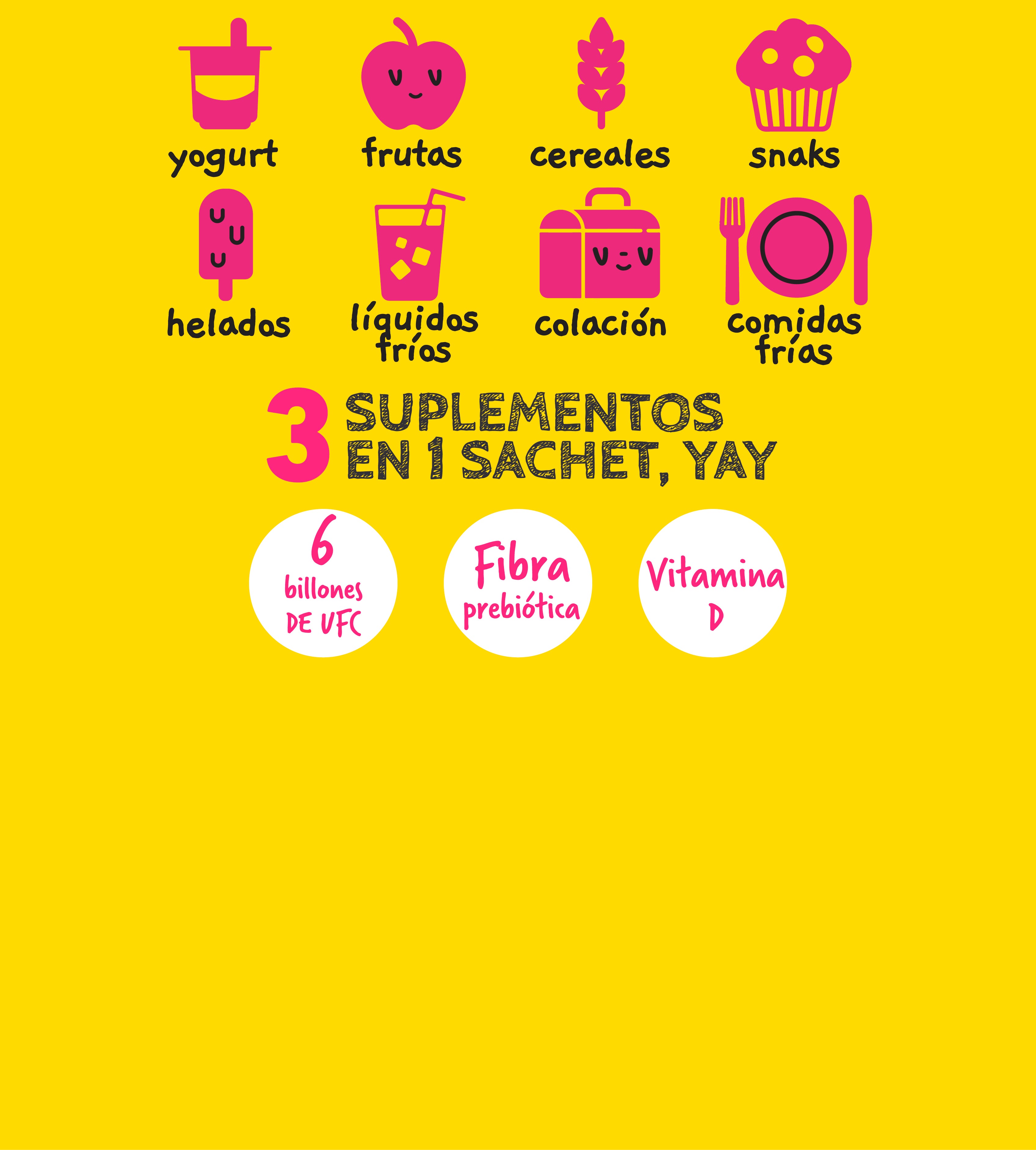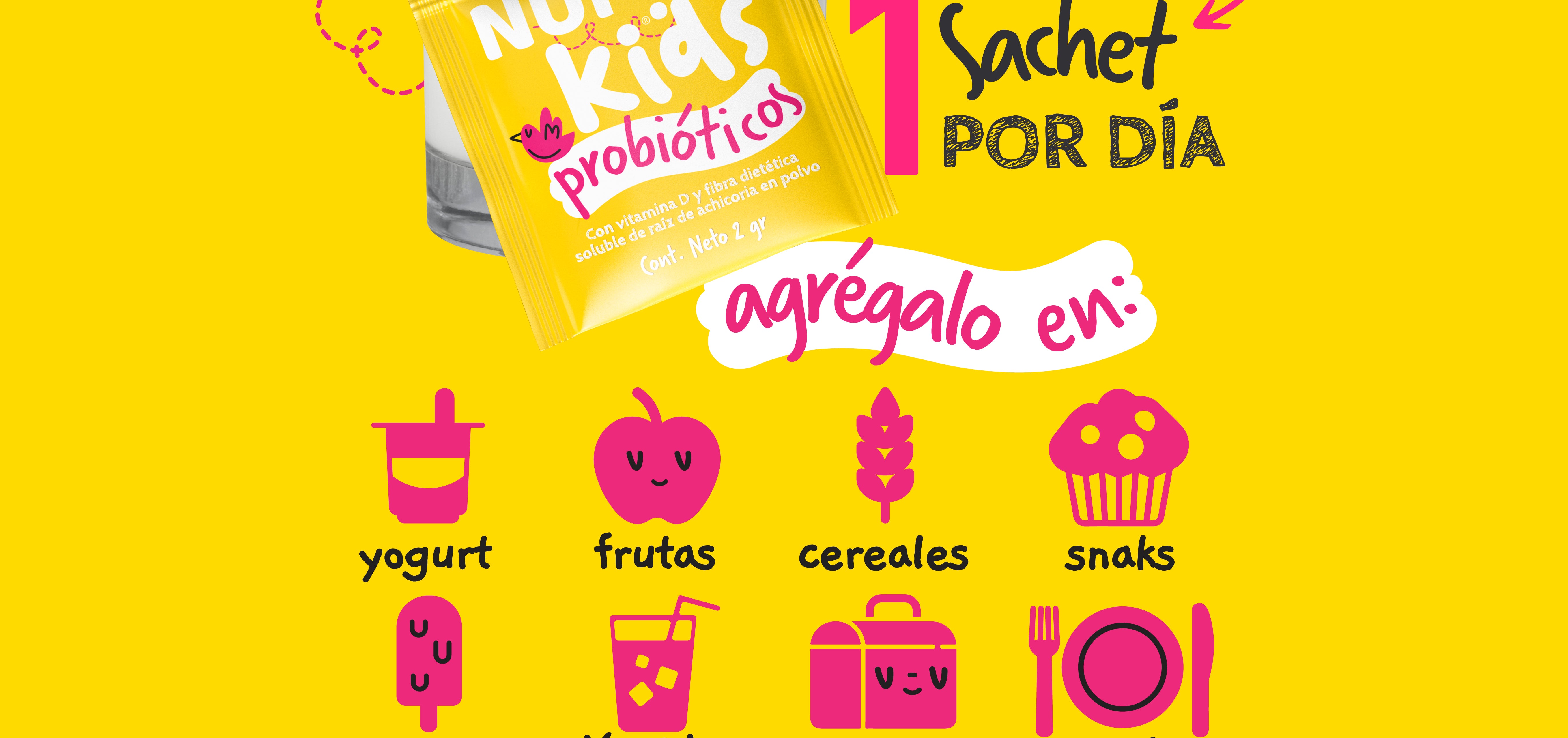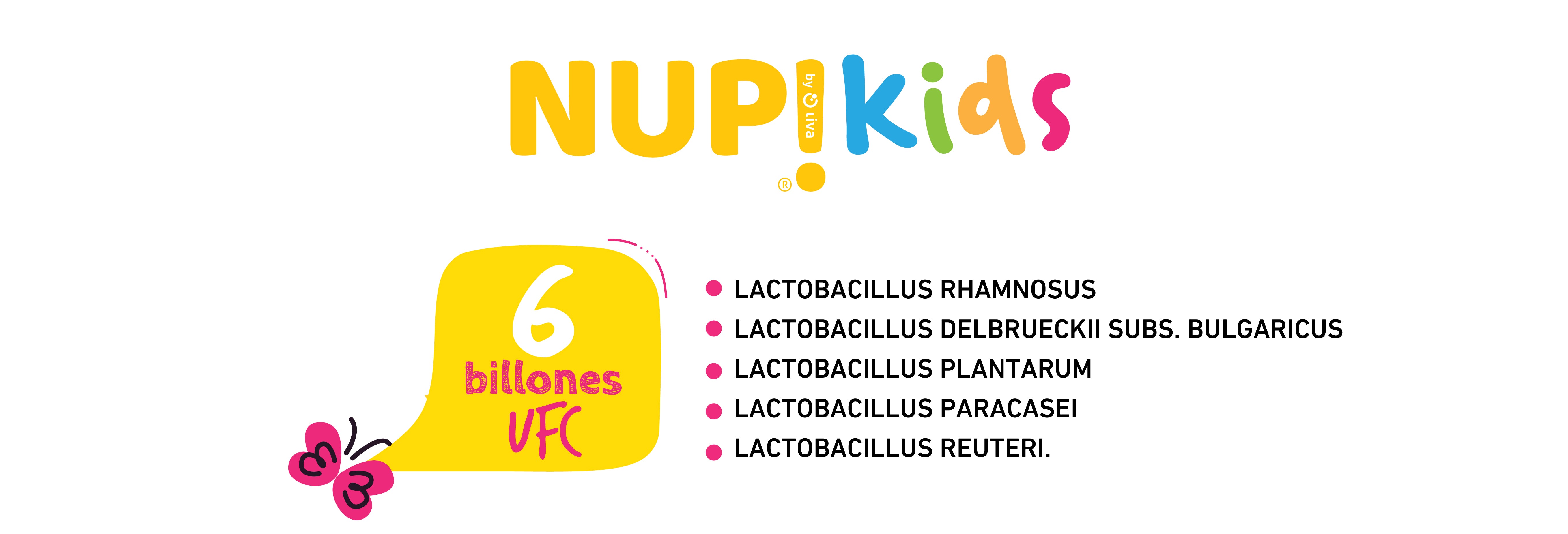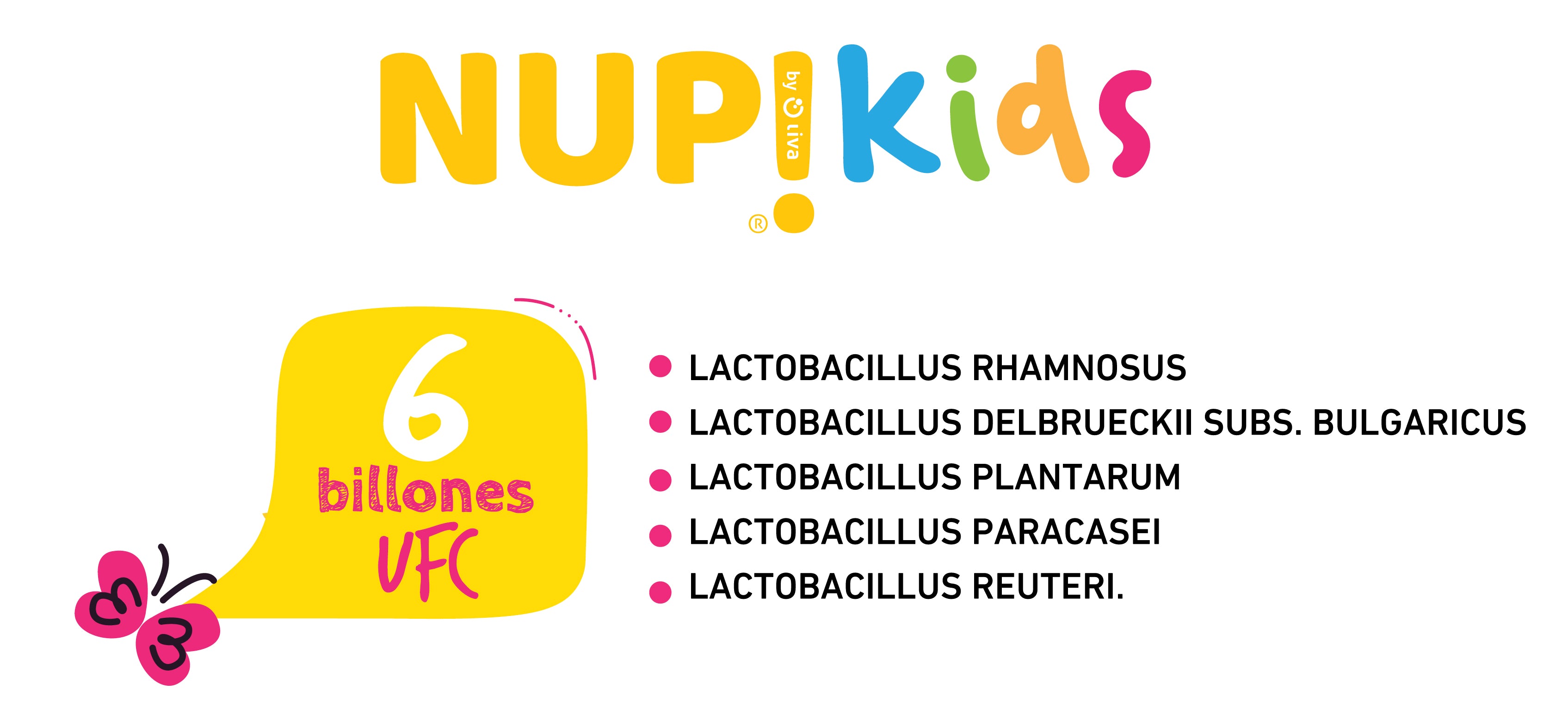 NUP!®Kids es el mejor alido para cuidar a l@s pequeñ@s de la casa de forma simple y rápida. Está formulado con 5 cepas probióticas del género Lactobacillus (6 billones de UFC por sachet), fibra prebiótica de alta calidad y vitamina D, ideales para contribuir a la salud digestiva y el sistema inmune a través del cuidado de la microbiota intestinal.