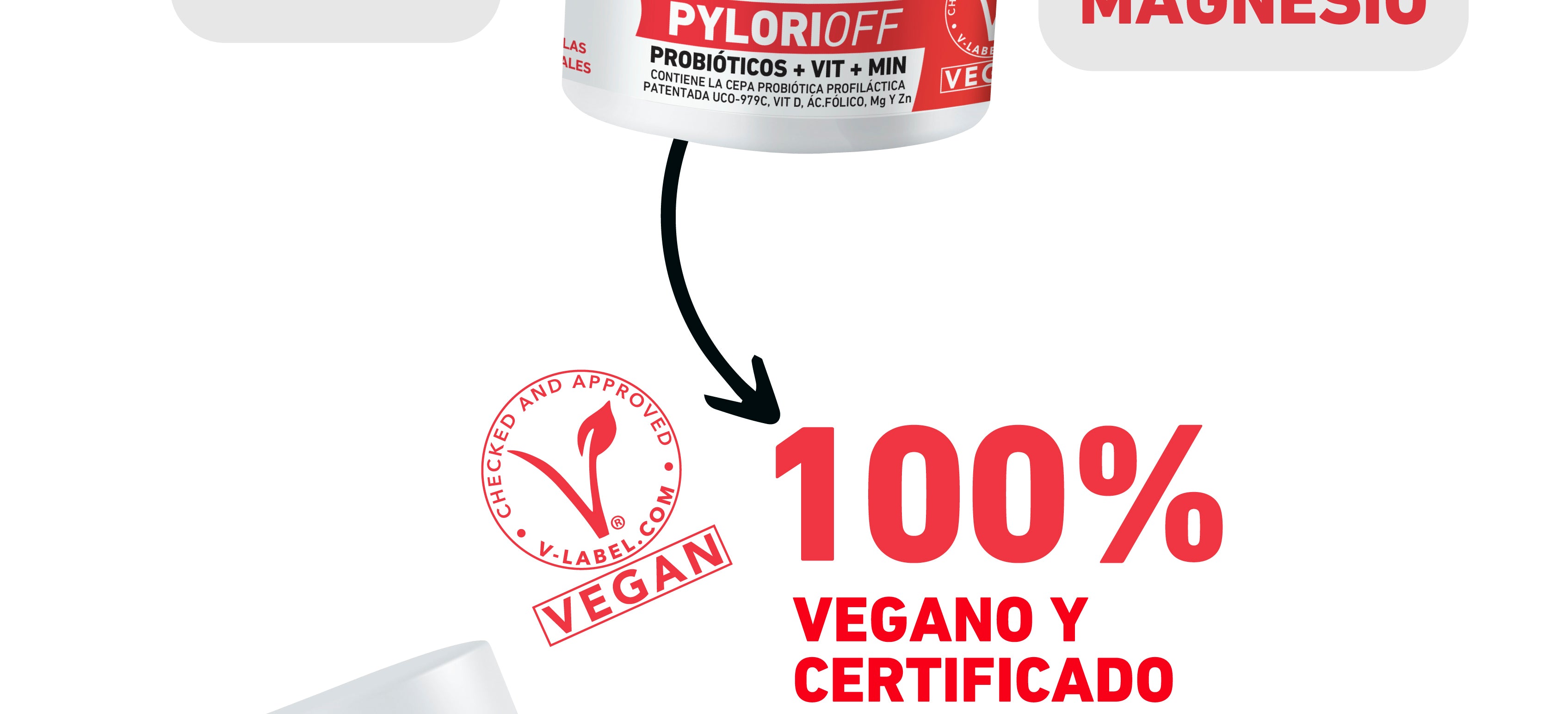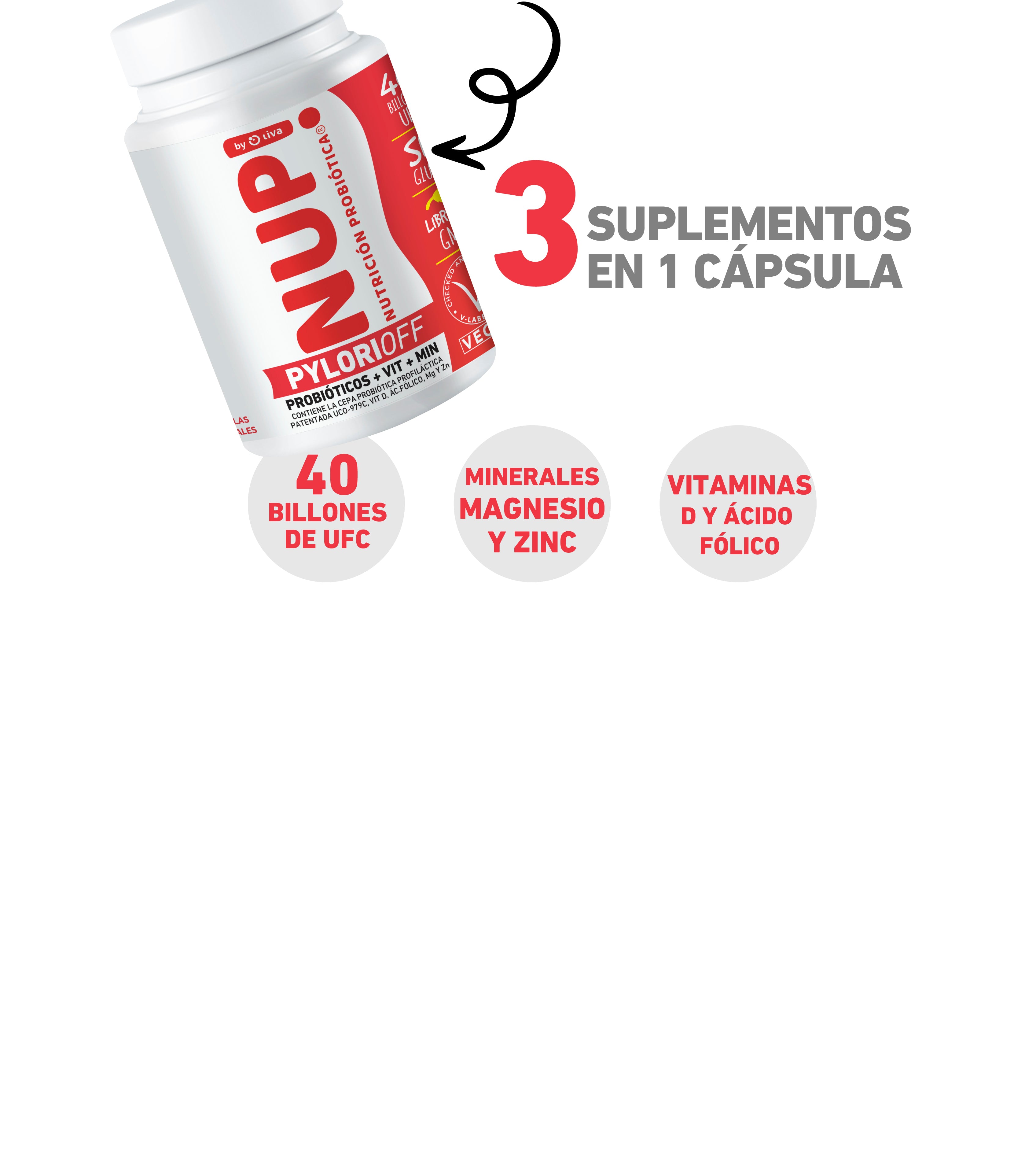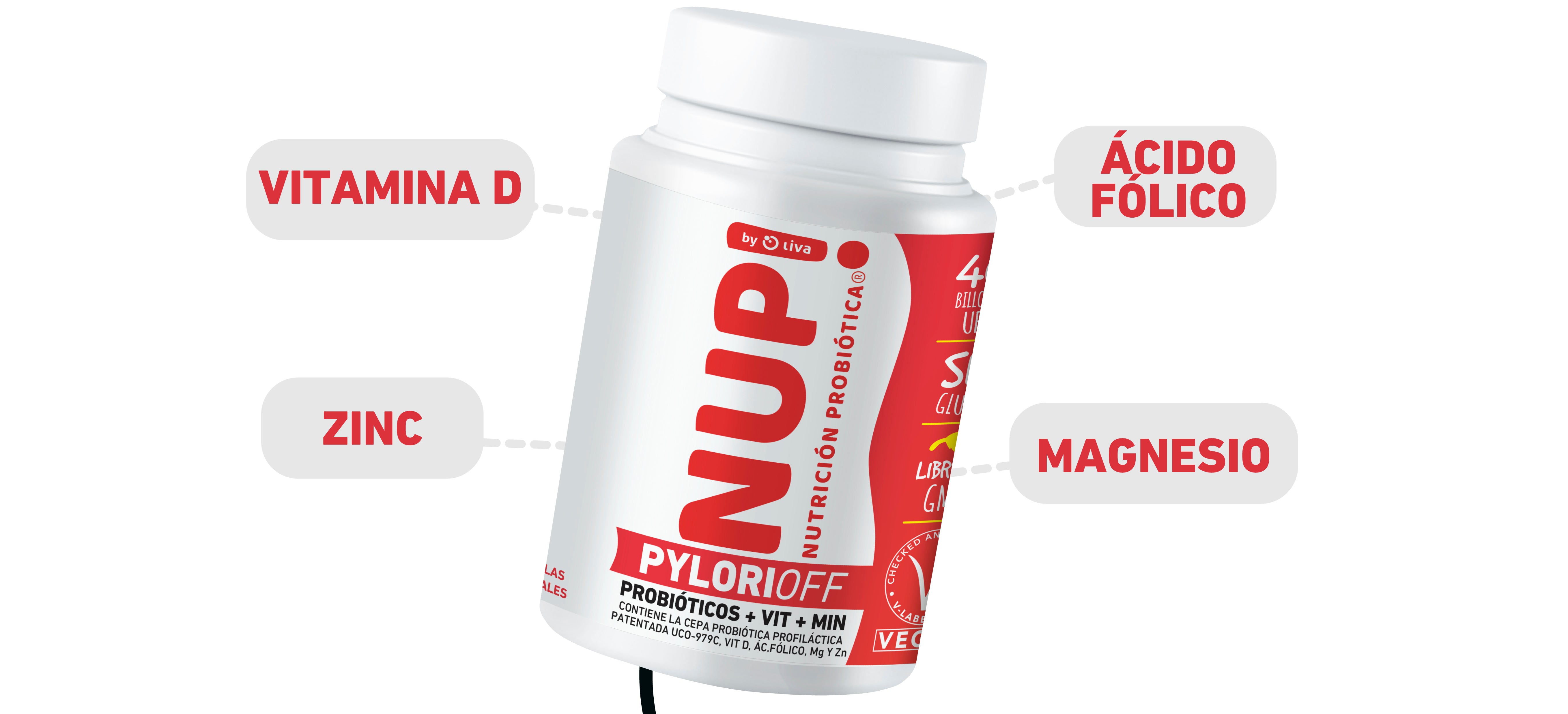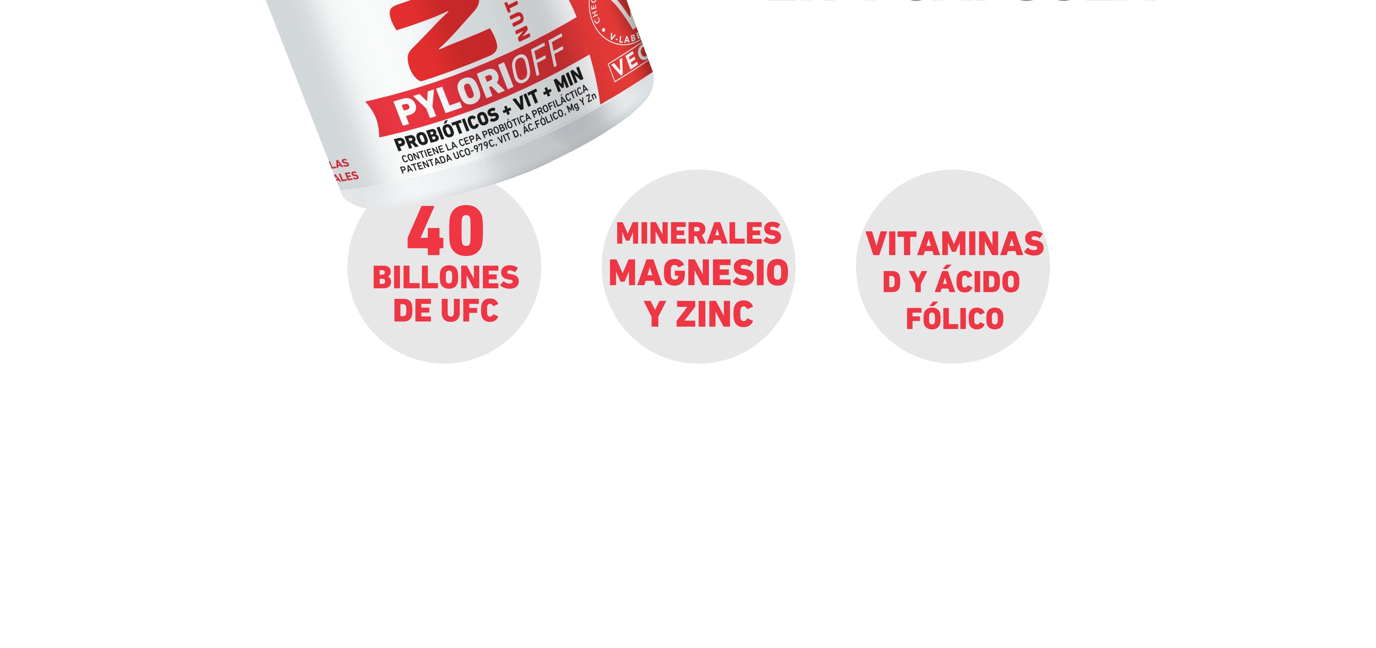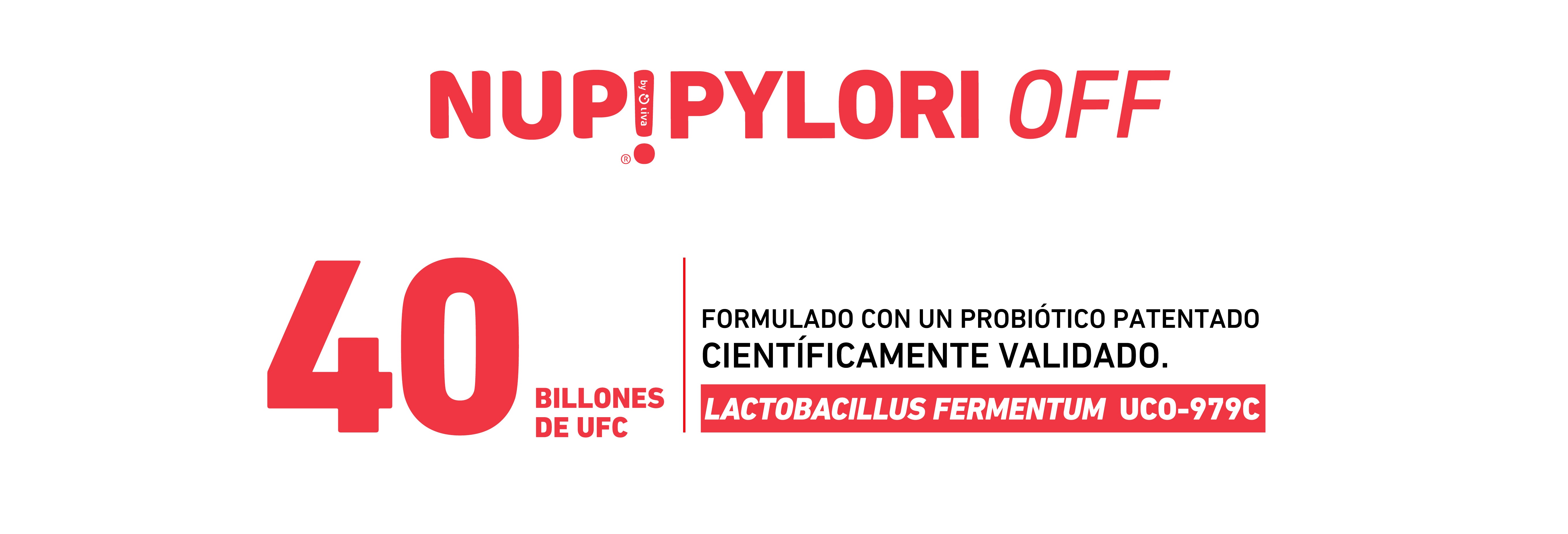 NUP!PYLORIOFF concentraciones de 40 billones de UFC por cápsula, fibra de achicoria, vitamina D, ácido fólico, magnesio y zinc.